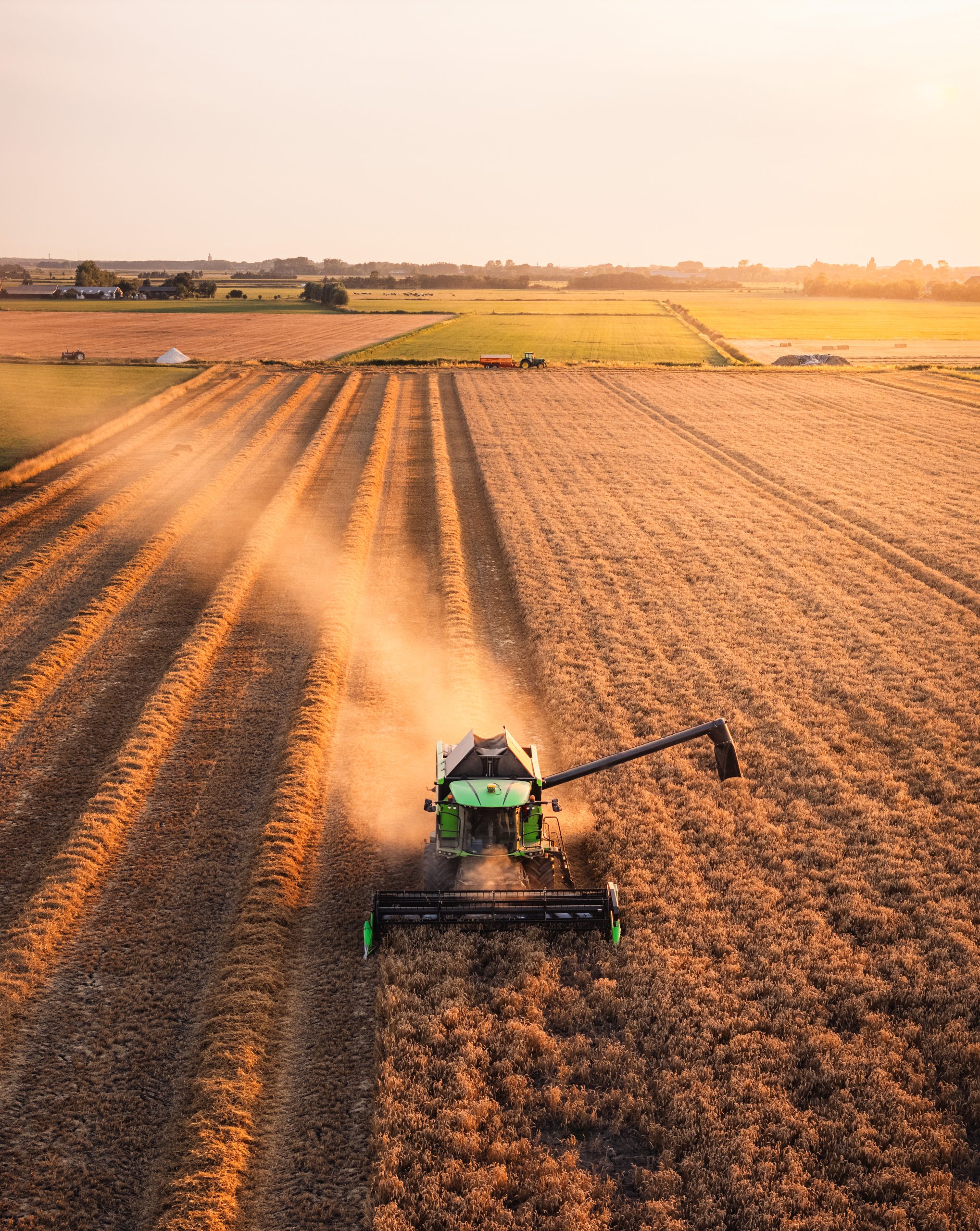 In de avonduren trekt de combine recht door het graanveld, gehuld in een gouden stofwolk. Het beeld laat de kracht en intensiteit van het dorsen zien en is het gouden uur van de boer. Daar waar hij het hele jaar voor heeft gewerkt kan eindelijk geoogst worden, waarbij het werk doorgaat tot de zon onder is.